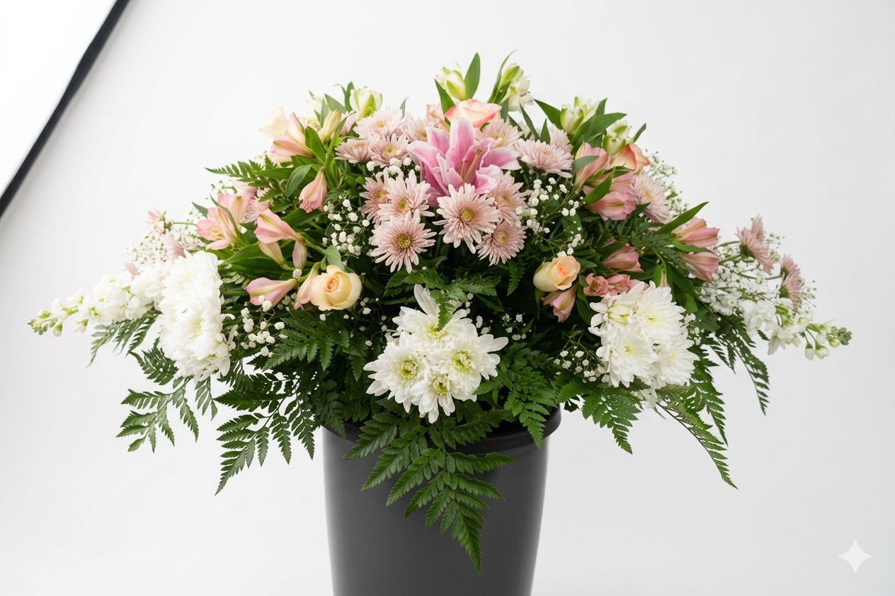 The “Eternal Grace” spray is a thoughtful and dignified tribute. This arrangement combines the soft beauty of stargazer lilies and white blooms with the classic touch of chrysanthemums and daisies. Carefully arranged with lush ferns, it offers a sense of peace and comfort during difficult times.