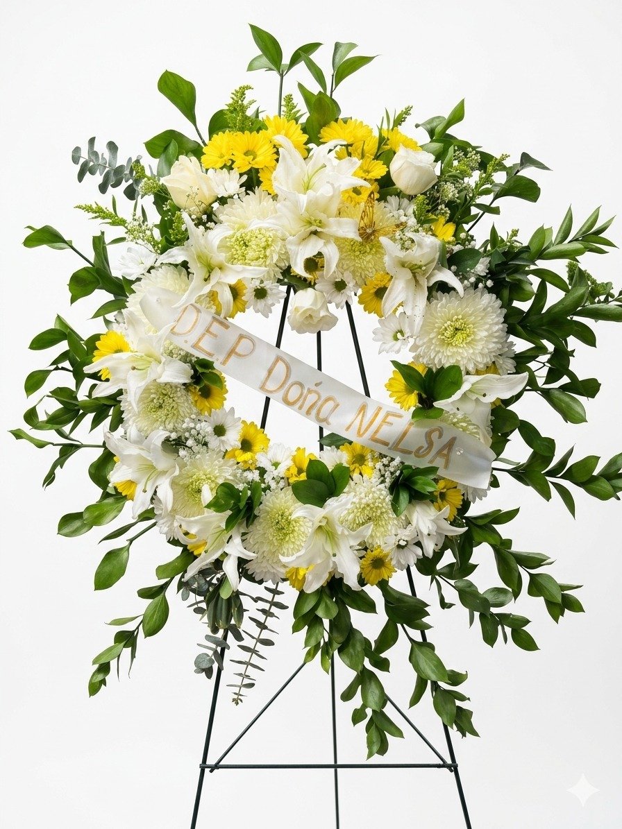 The “Eternal Light” wreath is a dignified and serene tribute. Hand-crafted with pure white lilies and yellow chrysanthemums, it offers a sense of peace and remembrance. This standing arrangement is accented with fresh eucalyptus and a customizable sympathy banner.