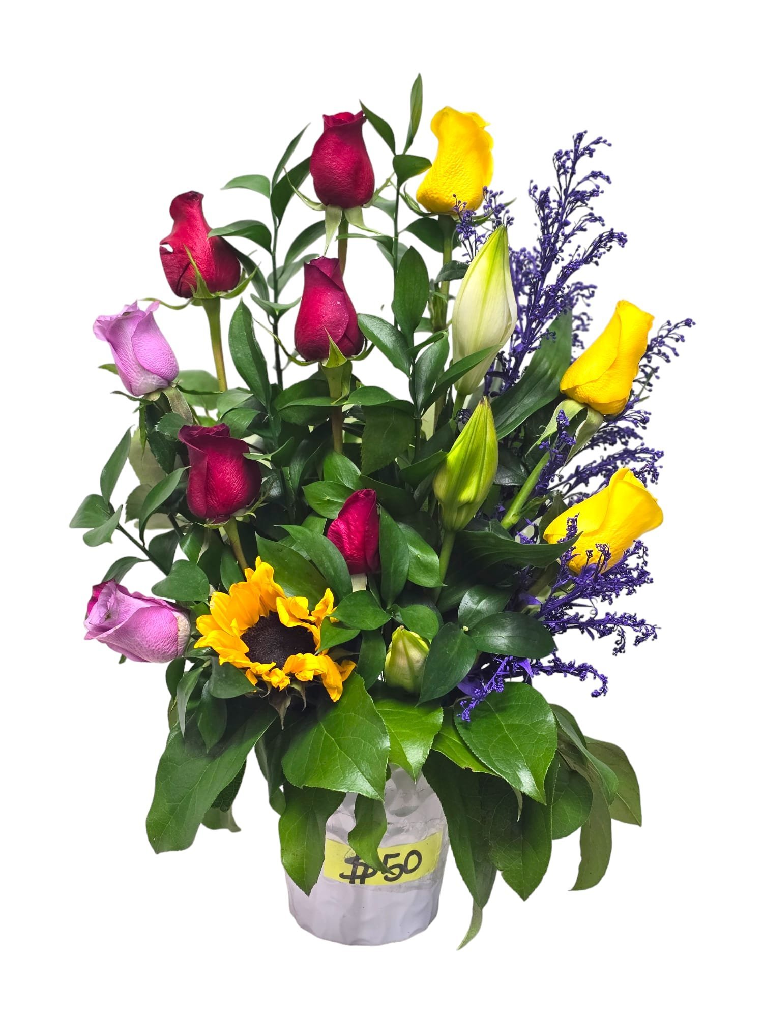 Roses, sunflowers, lemon leaf, solidago, lilies, Ruscus