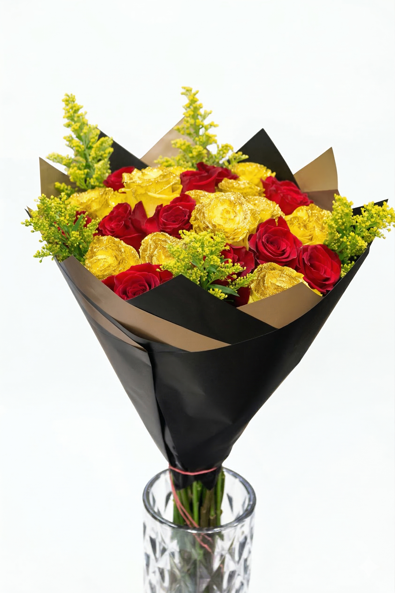A vibrant mix of red and yellow roses with a unique gold glitter finish. Wrapped in elegant black and gold paper with yellow solidago accents. A bold, luxurious statement for any occasion.