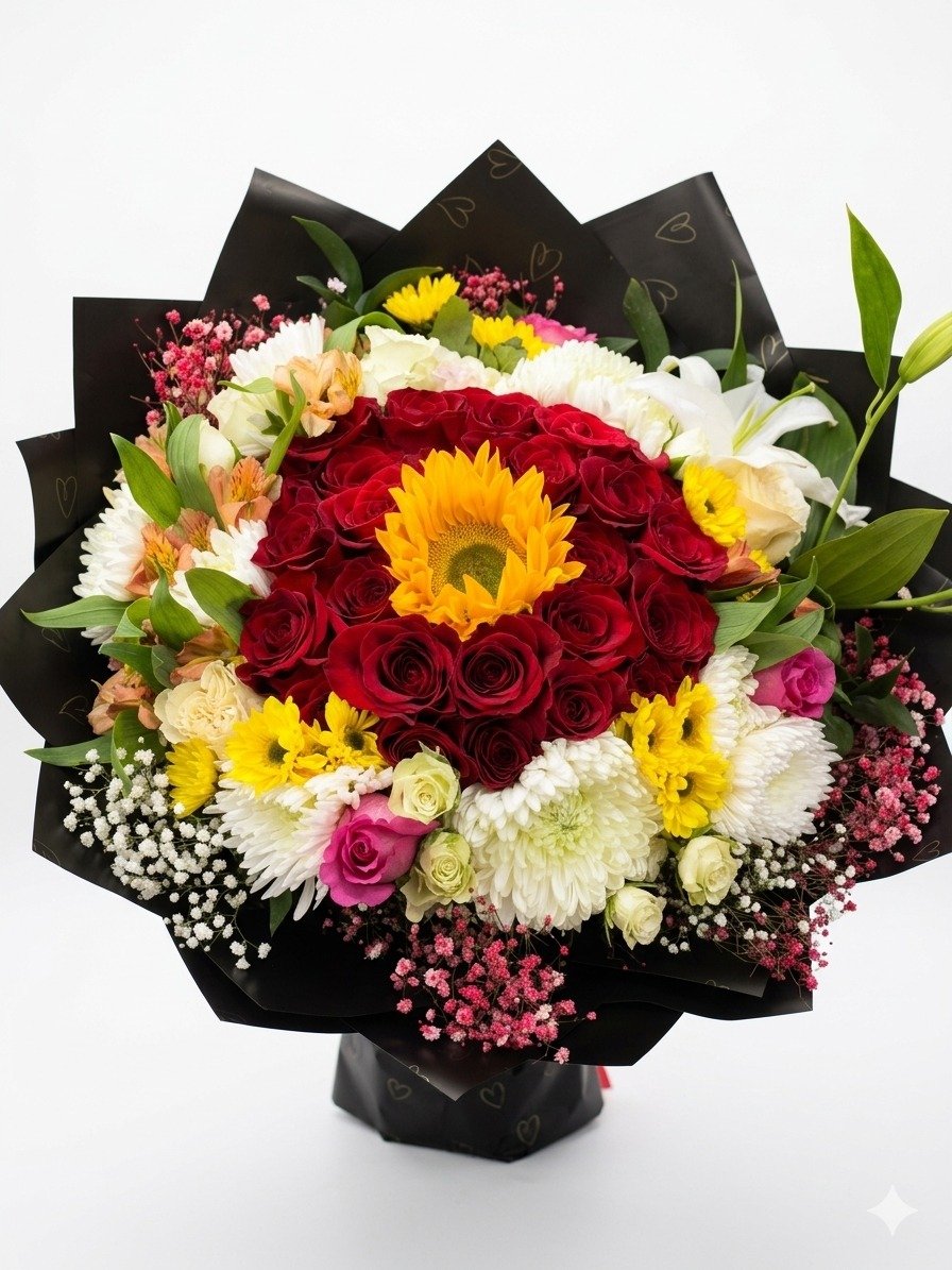 A stunning modern bouquet featuring vibrant sunflowers surrounded by red roses and yellow chrysanthemums, all elegantly hand-wrapped in black designer paper. Perfect for graduations and birthdays.