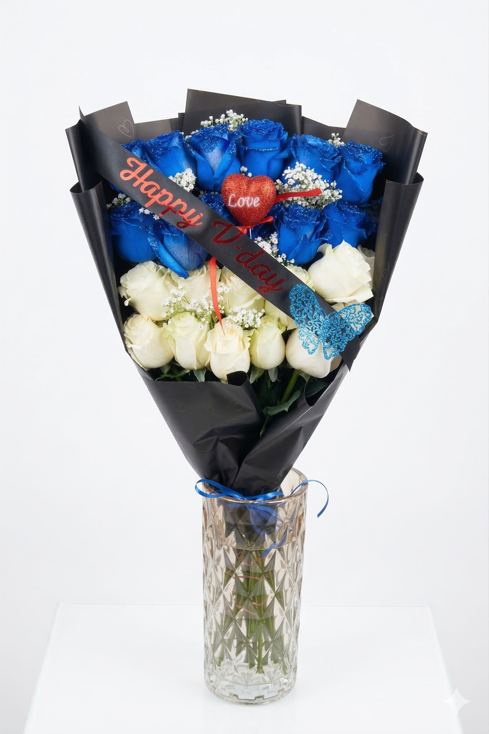 A unique V-Day arrangement of blue and white roses. Features a ‘Happy V-day’ ribbon, red ‘Love’ heart, and a glitter blue butterfly. Masterfully wrapped in black paper for a luxurious, modern feel.