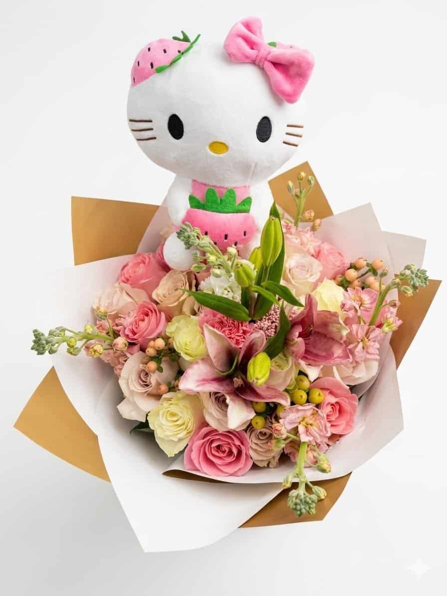 Adorably elegant, the “Sweet Strawberry” bouquet is the perfect gift for someone who loves all things cute. This stunning arrangement features a mix of premium pink lilies, soft cream roses, and seasonal pastel blooms, all nestled around a charming strawberry plush toy.