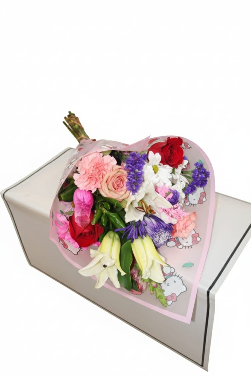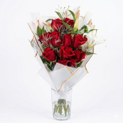 This charming arrangement is a playful and eclectic mix of textures and colors, designed to bring a smile to anyone’s face. It combines the elegance of classic lilies with a variety of cheerful garden blooms for a “just-picked” look that is full of personality.