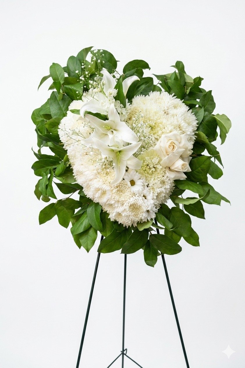 Honoring a life well-lived, our Pure Serenity White Floral Heart is a deeply symbolic tribute for funeral services and memorials. This standing spray is meticulously handcrafted with premium white carnations and roses, shaped into a heart to represent eternal love and peace.